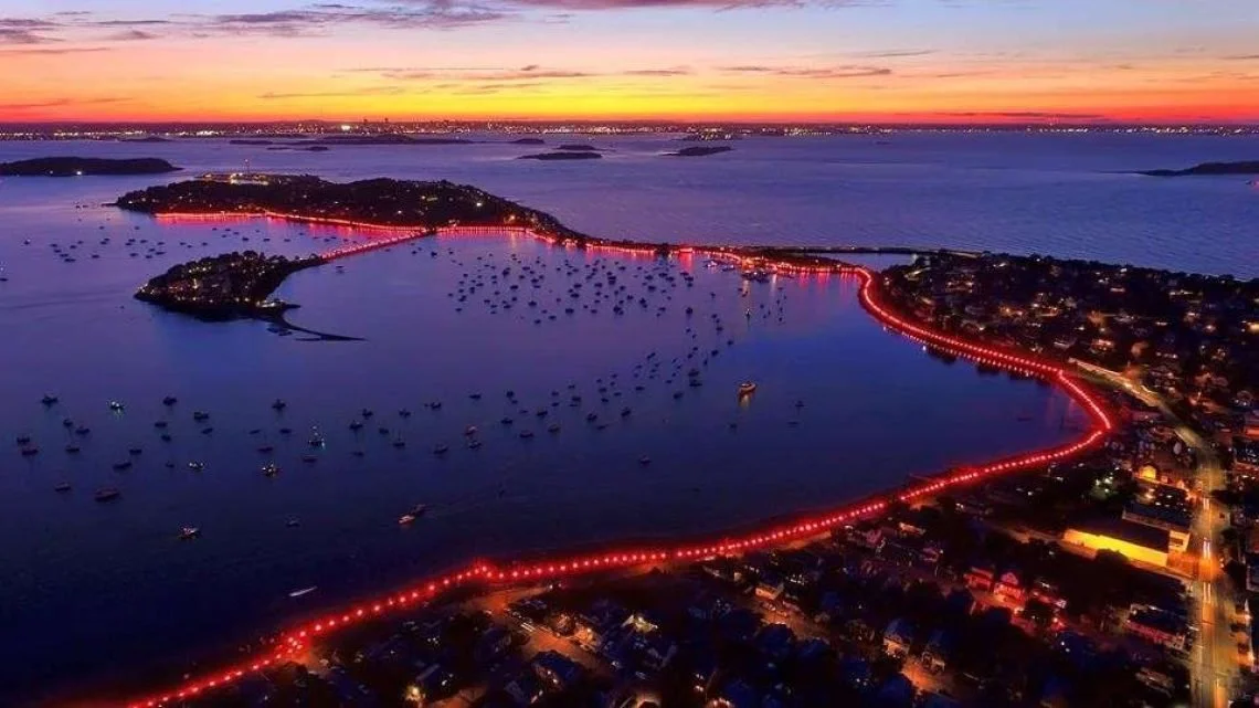 A thousand flares ignite along the shoreline, forming a glowing necklace of light that transforms the waterfront into a breathtaking spectacle.